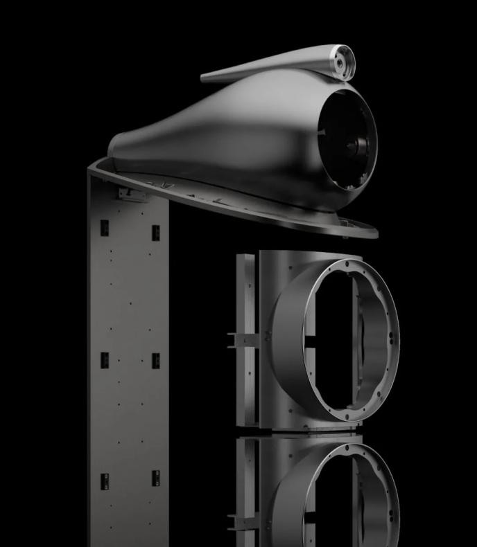 除了以往的水平結構,該款揚聲器還采用了鋁製垂直結構,通過螺釘和膠水固定,而不是簡單的緊壓密封。此外,整個Matrix框架現在使用一塊10毫米的堅固鋼板與前反射板相連。