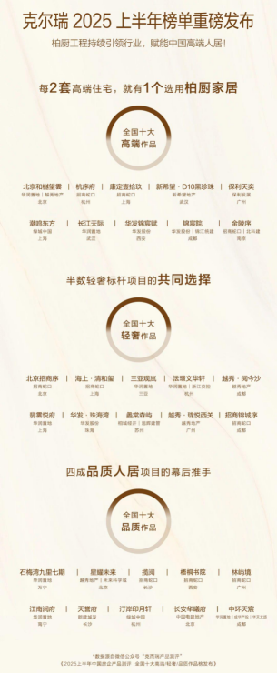 日前,由克而瑞產品力100工作組評選並發布的2025上半年中國房企產品測評結果正式公示。這場覆蓋全國60個入圍項目、曆經企業推選、專家評審、網絡票選等多環節的權威測評,最終決出三大類十大作品,形象勾勒出當下"好房子"的發展趨勢——科技賦能、文化融合、功能優化已成為核心方向。柏廚家居工程以突出實力,持續引領行業,賦能中國高端品質人居。在評選出的2025上半年全國十大高端作品中參建5個,十大輕奢作品參建5個,十大品質作品參建4個,其中與湯臣一品、深圳灣壹號並稱"中國傳奇豪宅"的武漢新希望·D10黑珍珠項目成功落地,多番成績印證了其對高端人居需求的精準把握與全場景服務能力。